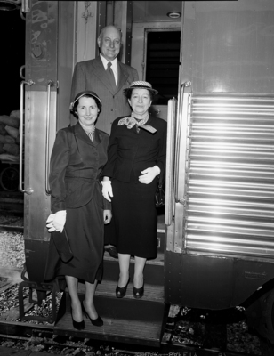Chicago Bound - A pair of boosters for Senator Russell, Mrs. Bennett L. Smith of Fort Worth, Left, alternate delegate to the Democratic National Convention , and Mrs. John J. Perry of Sweetwater, delegate from the 17th Congressional District, prepare to depart here Saturday for the convention. behind them stands Smith, who says he is going along just for the trip.