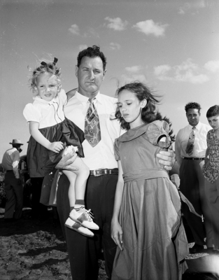 Survivors of tragedy - J. W. Hudson of Dallas with his nieces, Nancy Jane Hudson, 3, and Jeanette, 12, after funeral of their 3 sisters.