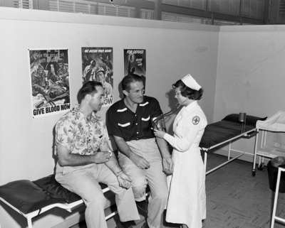Cats Lead off - Starting the Fort Worth Cat's drive for more donations to the North Texas National Defense Blood Center, AI Brancato, third baseman, left, watches his teammate Pete Mondorff being readied for a blood donation. Checking the pitcher is Nurse Mary Hulsey.
