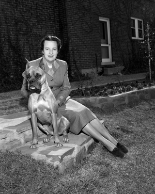 Gretchen von Nahoff, boxer owned by Mr. and Mrs. Charles Hoffman, 2806 5th Ave., and posed here with Mrs. Hoffman, is one of the dogs entered in Fort Worth Kennel Club's all-breed show. Published in Fort Worth Star-Telegram morning edition April 2, 1950.