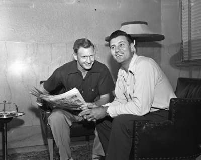 Third baseman Jim Ackreet, left, a cat in spring of 1950, and catcher manager Mickey Livingston take it easy. They are sitting and having a conversation.
