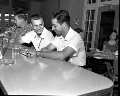 Shortstop Joe Koppe left, and second baseman Chico Garcia talk over crucial series starting tonight. They are seated next to each other at a restaurant bar.