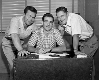 Sports' sluggers are, left to right, outfielder Harry Elliot, first baseman Grant Dunlap, and outfielder Joe Szekley. Dunlap is league battling titlist. Published in Fort Worth Star-Telegram evening edition, July 25, 1952.