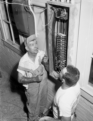 Gift From Labor - W. S. Flowers, left, of 2312 East Lancaster, and E. L. Kerr of 3244 Illinois Avenue, are two of many members of Local 116, International Brotherhood of Electrical Workers, who are contributing their work free to Goodwill Industries. The men are installing wiring at the new building, 665 S. Main.