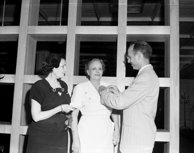 Mrs. Georgis Moss Thomas, center, chief operator of Southwestern Bell Telephone Company's central office here, receives a 40-year pin from Curtis Mallory, district traffic superintendent. She and Miss Ada Mae Stewart, left, a central office clerk with the company 45 years, were honored at a luncheon Friday at Western Hills Hotel. Mallory, too, received a pin- for 15 years' service.