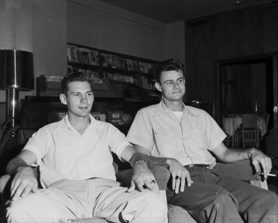 A photograph of Dick Mitchell, left and Art Dyck, right of Beaumont Baseball. They are shown seated in chairs.