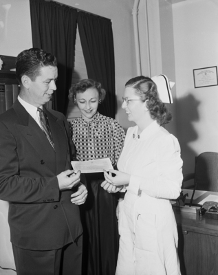 B. W. Rainey, left, commander of Post 708, VFW, presents a check for $100 to Miss Loreen Phillips, nursing supervisor at City County Hospital, to be used in the hospital's polio ward. Mrs. Rainey, president of the post auxiliary looks on. The gift was presented in honor of 9 year old Gary Alan Shepherd, a patient in the ward.