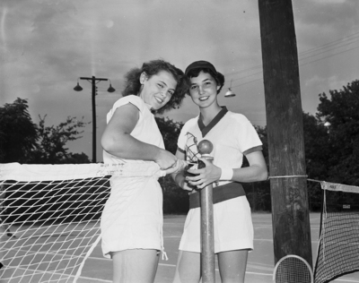 Ginger Wofford, left, and Rosemary Gallagher take another hitch in the net during their match in City net meet. Ginger won in straight sets by scores of 6-2. Published in Fort Worth Star-Telegram morning edition, July 28, 1951