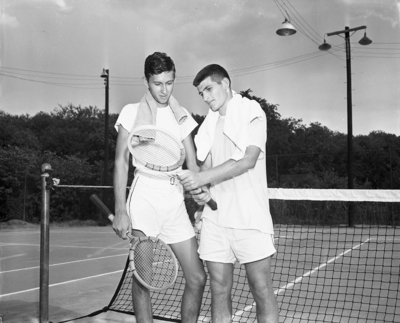 Bunky Berner, right, finalist in boys' singles who teamed with Jerry Miller to win boys' doubles in city net meet, shows finer points to David Kerns, whom he beat earlier in meet. Published in Fort Worth Star-Telegram, July 29, 1951