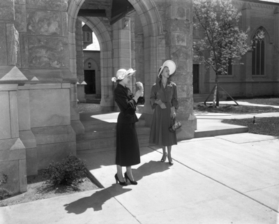 Doris Pratt, left, and June Amos are all dressed up for spring. Doris wears a navy faille suit accented with rhinestone buttons with navy doeskin shoes and a bag of pale pink rose-decorated Baku straw hat by Dajon June is modeling a coat dress by Georgia Bullock of brown alpaca with gold overtones. Her hat is of wheat milam in brown Gros grain and her matching shoes and bag are of printed silk shantung by DeLiso Debs. Clothes from Wally Williams. Published in Fort Worth Star-Telegram morning edition April 2, 1950.