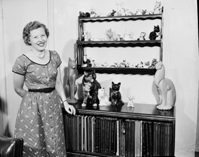 Mrs. H. E. Coy and her collection of china and pottery cats. There are large cat figurines on the table and smaller ones on the wall shelf.