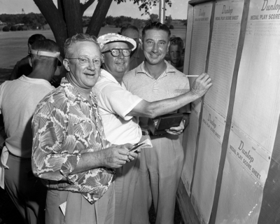 Erie Turner and Maury Hughes of Glen Garden and Brownwood Pro Cliff Caderwood, left to right, list scores. Calderwood is official starter for the tournament. Published in Fort Worth Star-Telegram evening edition July 31, 1952