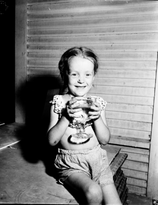 One of the better ways to beat the heat is by the internal application of cool, cool water, demonstrated here by "Rusty" Willman, 5, daughter of Mr. and Mrs. J. C. Willman, 1716 fifth Avenue. Rusty is holding a glass of water.