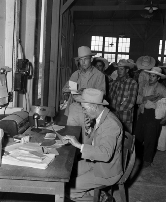 Bob Sherrill, seated, manager of the Trans Pecos Cotton Association, prepares an invoice for Mexican workers and Paul Armstrong, standing, who is ready to leave with workers he has assembled at the center for harvest work.