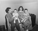 A quartet of cousins: left, Clement Moore holds his brother, Michael, and right, Lloyd McKee holds her brother, Bruce. The young Moores united here with their parents, Dr. and Mrs. L. Patrick Moore of New Canaan, Connecticut, guests of Mrs. Moore's sister and brother-in-law, Mr. and Mrs. Edward W. McKee, 1505 Elizabeth Boulevard. Young Clement has resumed his studies at Phillips-Exeter Academy in Massachusetts, and Lloyd, her studies at the Hockaday School, after a trip to Mexico City with her grandmother, Mrs. J. W. Mitchell, 6123 Curzon. Published in Fort Worth Star-Telegram morning edition, April 30, 1950.