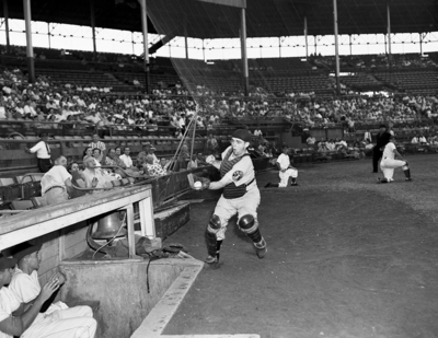 Hobie Landrith, Tulsa catcher, makes a retaining stab at a pop fly in the second inning of the opening Cat game at La Grave Field. Hobie almost went into the Cat dugout to retire John Simmons on the play. Published in Fort Worth Star-Telegram morning edition, August 03, 1952.