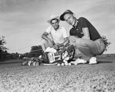 As Jimmy Powell, left, of Dallas watches, as Chris Gers of Oklahoma City prepares to practice after pair gained finals of Glen Garden Invitation golf tournament. Published in Fort Worth Star-Telegram morning edition August 3, 1952