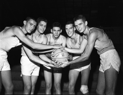 These five members of North all-star basketball team all averaged better than 20 points per game last season. Left to right, Wayman (Jiggs) Buchanan, Carter Riverside, 24; Larry Showalter, Dallas Adamson, 27.7; C.L. Nix, Laneville, 22.4; Mack Carter, Borger, 21.9, and Joe Mitchell, Denton, 21.2. The players are posed in a semi-circle, all holding the basketball in the center.