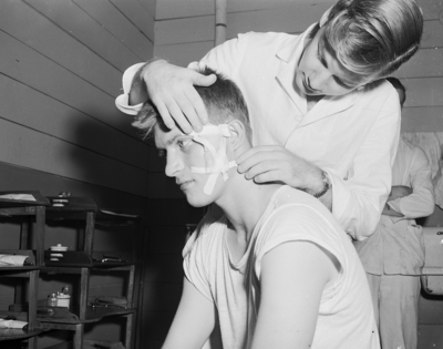 Survivors of Greyhound bus crash near Waco. All servicemen. William Vitkus gets first aid from Lowell Kigar.