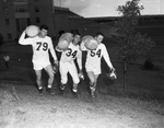 Texas High School All-Star football players from left are Bobby Blakeley of Longview (#79), Rusty Gunn of Arlington (#34), and Jim Smith of Grand Prairie (#54) practice by walking across the field carrying weighted sand bags on their shoulders.