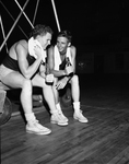Joe Lindsey, left, of Madisonville and Bradley Pigeon of San Antonio Alamo Heights enjoy soft drinks after the South all-star cagers practice Wednesday afternoon. They are seating at the sidelines next to each other. Both will star in the game Thursday night at Will Rogers Memorial Coliseum.