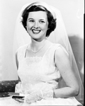 A woman in a wedding gown posing frontal view with a smile. She has laced gloves and is holding a Bible.