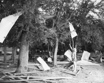 Storms. Eagle Mountain Lake Area. Mrs. Dorothy Stockard, co-owner of Snug Harbor, points to pieces of iron stripped off her boathouse by the winds.