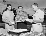 West Central Texas Oil and Gas annual barbecue on Possum Kingdom Lake. Left to Right, R. J. Tiffany, Abilene, French M. Robertson, Abilene and Lester Clark, Breckenridge. They are standing next to each other getting ready barbecue plates.