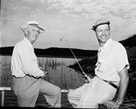 Left to Right, West Central Texas Oil and Gas annual barbecue on Possum Kingdom Lake. W. B. Duke and Lewis bond Jr. , of Fort Worth are fishing from the dock.
