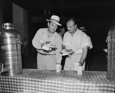 Bob Martin, Brownsville, left, and Ted Dawson, right, High School football coaches. They are picking up drinks to go with their lunch plates.