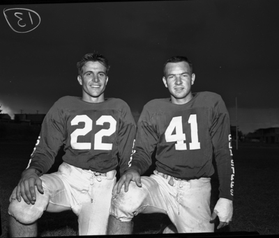 High School All-Star football players Adelbert #22 and Bobby #41 are in a kneeling pose.