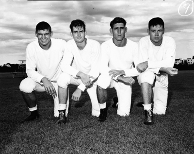 High School All-Star football players Green, Gray, Williams and Wilson are in a kneeling pose on the field.