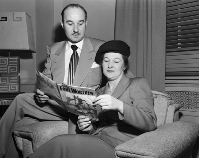 Josef Meier and his wife, who plays the roles of Christ and Mary, Mother of Jesus, in the "Black Hills Passion Play", read an article concerning the play in the Fort Worth, Chamber of Commerce.