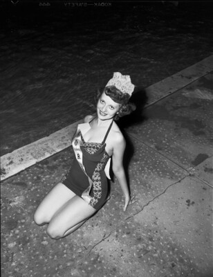 Miss Elaine Baggett is Tuesday's Circus Queen. She is wearing a bathing suit with a "Forest" sash, kneeling beside the pool.