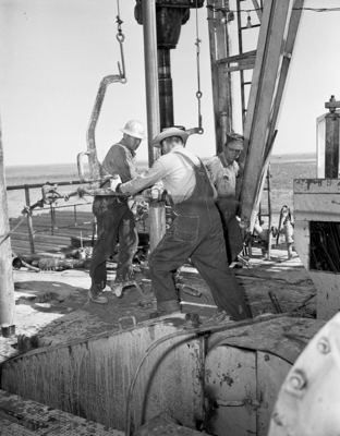 Under Way - Three members of the drilling crew at western Tarrant County's first deep oil test, which got under way last week. It is the Rowman Oil Company, Hill & Hill and Cities Production Corporation No. 1 Markum, R. Bissett survey, A-192, four miles northwest of Benbrook. It will seek Ellenburger production to 7,800 feet. The crewmen, left to right, are E. D. Gellner, Bill Ball and W. M. Barker.