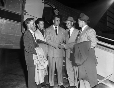 Dee Fondy, just in from California, stays to meet the travelers from Florida. Left to right are Fred Storck, Joe Torpey, Russ Rose and Dick Williams. Doris Parker is in the background.