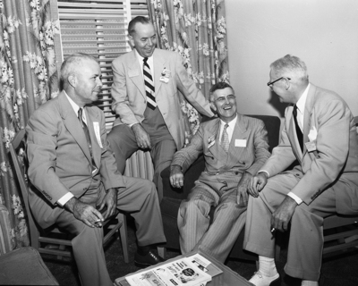 There's always someone with a new story at a convention, and this was true Monday at the Texas Pharmaceutical Association's meeting at Hotel Texas, when (left to right) H. A. Hestand of Sherman; Lester Short of Midland, Dean H. M. Buriage of Austin, and R. T. Sanner of Detroit, Michigan, got their heads together.