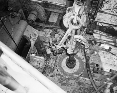 Drilling has progressed below 5,340 feet in hard sandy shale at western Tarrant County's scheduled 7,800 feet wildcat. Shown is W. M. Barker at the test, Rowan Oil Company, Cities Production Company, and Hill & Hill No. 1 B. Markum R. Bissett survey, four miles northwest of Benbrook.
