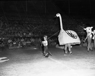 Recreation Department. Annual Circus. Unidentified youngster leads a paper mache ostrich around the circus arena.