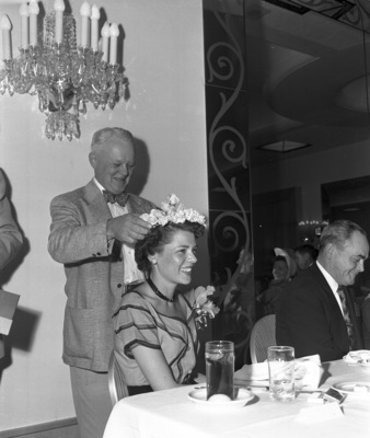 Miss Gaile Huckabee is crowned queen of Texas Pharmaceutical Association convention at Hotel Texas by Porter King, president of King Candy Company.