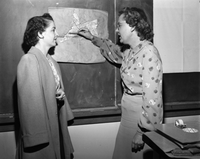 Mrs. Byrtie Belle Adams of 4112 Fairfax, right, and a census crew leader, points out the enumeration district which Mrs. Ila B. Farrell of 5025 Penrod Court is to cover. Published in Fort Worth Star-Telegram morning edition April 2, 1950.