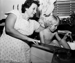 After the fourth day of water shortage in Browning Heights, Mrs. C. M. Hayes of Smith Saint, cannot even bathe her niece, Paula Jean Bass, 6, in her sink where she had stored a little water in pans before the faucet went dry. A pump breakdown was blamed for the shortage.