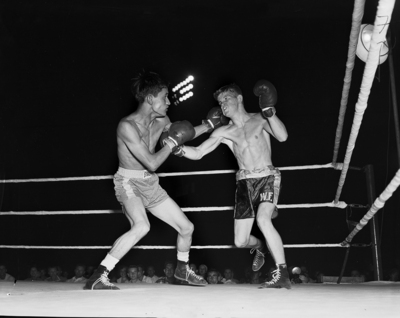 Mike Martinez of Dallas, left, lands with the left hook to the face of Donald Barnett, Wichita Falls, Texas Amateur Athletic Federation (TAAF) flyweight battle at Rockwood Park. Barnett captured decision. Published in Fort Worth Star-Telegram morning edition August 16, 1952.