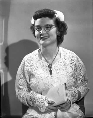 The marriage of Miss Mary Frances Flowers, daughter of Mrs. T. E. Flowers, 1900 5th Avenue, and Staff Sargent Samuel C. McSween Jr., Columbus Airforce Base (CAFB), took place at 9 P. M. Saturday at the Memorial Chapel of First Methodist Church. Mary Frances is wearing a lace top and lace gloves and holding a Bible.
