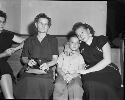 Left to Right, Mrs. J. W. Conner of Venture, California, Charles Ray Patterson and Mrs. Dallas Bireh, who is gives Charles a hug as they sit on the bench.