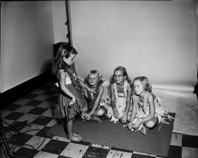 Diane Webster, standing, shows Judy Kelly, Gwen Sprinazola, and Connie Marchbanks, left to right, the techniques of the hula danced by the girls during a recent neighborhood Milk and Ice Fund benefit. Other children participating in the benefit, held in the front yard of 6193-95 Straley, were Linda and Larry Randlett, Shirley and Tony McPhail, and Cherry Marchbanks