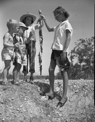 Annual Boy and Girl Fishing Rodeo at White Lake. Left to Right, Cecil Brewer, Garry Rothrock, Sharon Huffman, and Patricia Herring. They are showing their catch of the day. The girls have caught more fish.