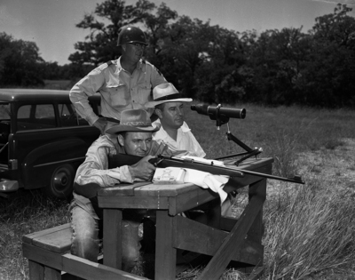 Eagle Mountain Lake National Guard rifle range. C. E. Bombardier is about to fire; Lieutenant Colonel Lynn M. Yeatts is watching the target and Colonel John F. B. Lyons awaits his turn with the gun. There is a car parked behind the men.
