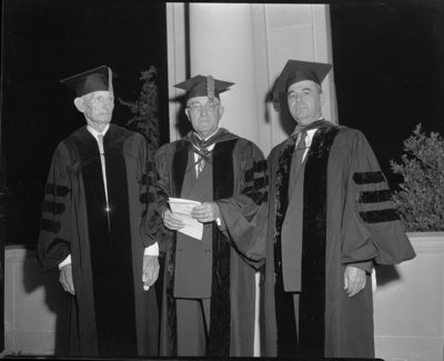 Left to Right, Charles H. Hale, M. E. Sadler, Chancellor, and Ed Gossett in academic gowns.
