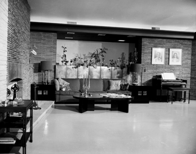 Linoleum floors, tile and stone walls and inviting furniture combine to make the living room at the J. A. Gooch home a place of real contentment. Potted plants, portraits and organ make up the personal touch that adds charm to the residence at 4400 Ridghaven Court.